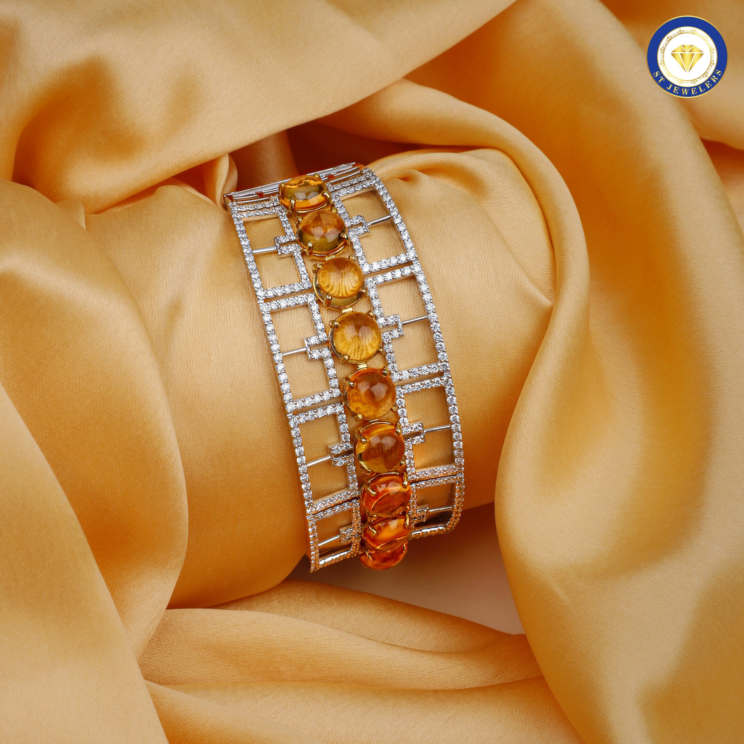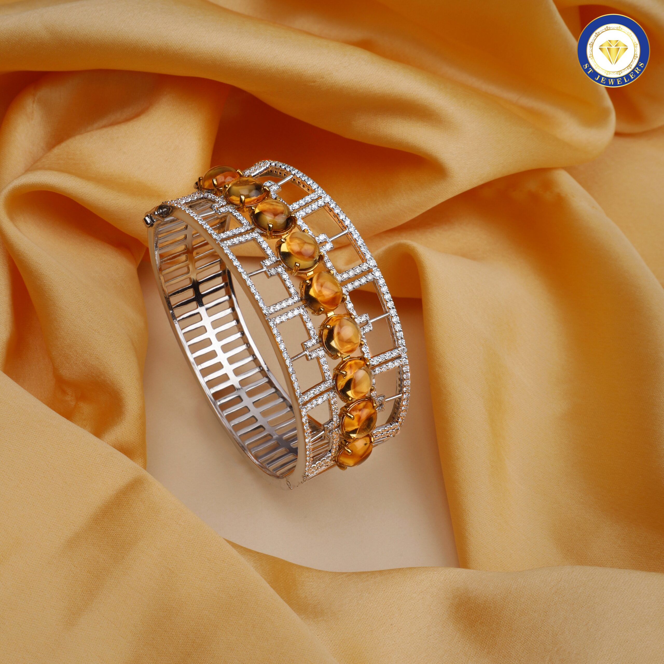 The Beautiful Sunrise Bracelet mirrors the soft glow of a rising sun through its natural citrine stones complemented by sparkling natural diamonds. Crafted in a classic blend of gold and silver, this oval-shaped, openable bracelet (size 2.4) brings gentle warmth and charm to any outfit. The sunny citrine gemstones create a soothing, uplifting palette that blends beautifully with both festive colours and everyday ensembles. With its comfortable design and radiant finish, it adds understated luxury while maintaining an elegant statement feel?perfect for gifting or adding golden brightness to your own collection.