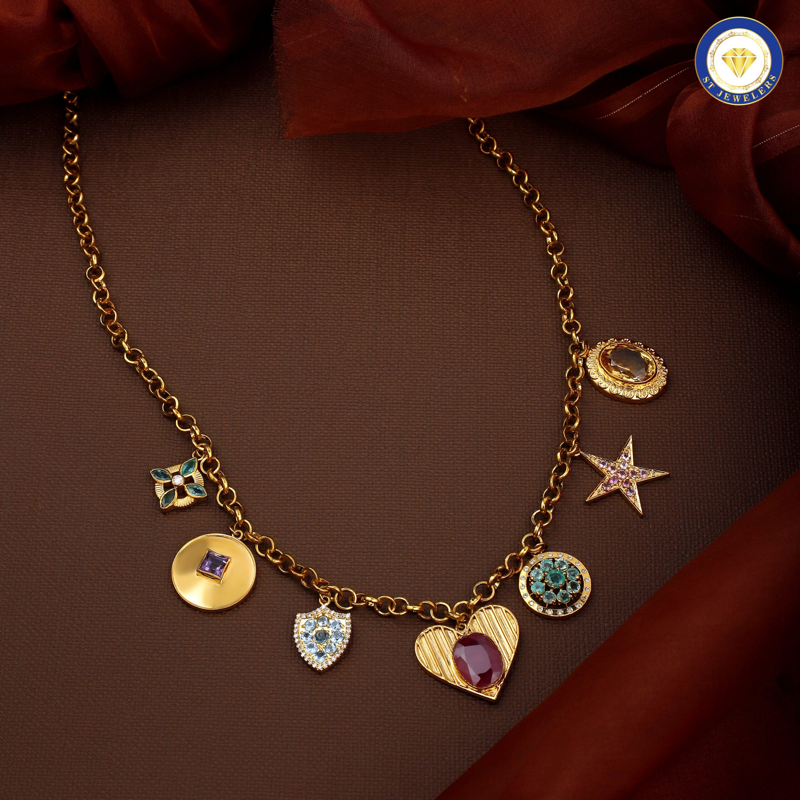 This vibrant necklace is a celebration of color and elegance, featuring a stunning mix of precious and semi-precious stones, including emeralds, glass-filled rubies, blue topaz, citrine, amethyst, and pink tourmaline. Sparkling natural diamonds accentuate the gemstones, adding brilliance and sophistication to the design. Expertly crafted in silver with luxurious 24k gold plating, the necklace radiates a warm, refined glow while showcasing meticulous artistry. Each stone is carefully set to highlight its natural beauty and color, creating a harmonious and eye-catching statement piece. Perfect for special occasions or glamorous evenings, this necklace embodies luxury, vibrancy, and timeless style.