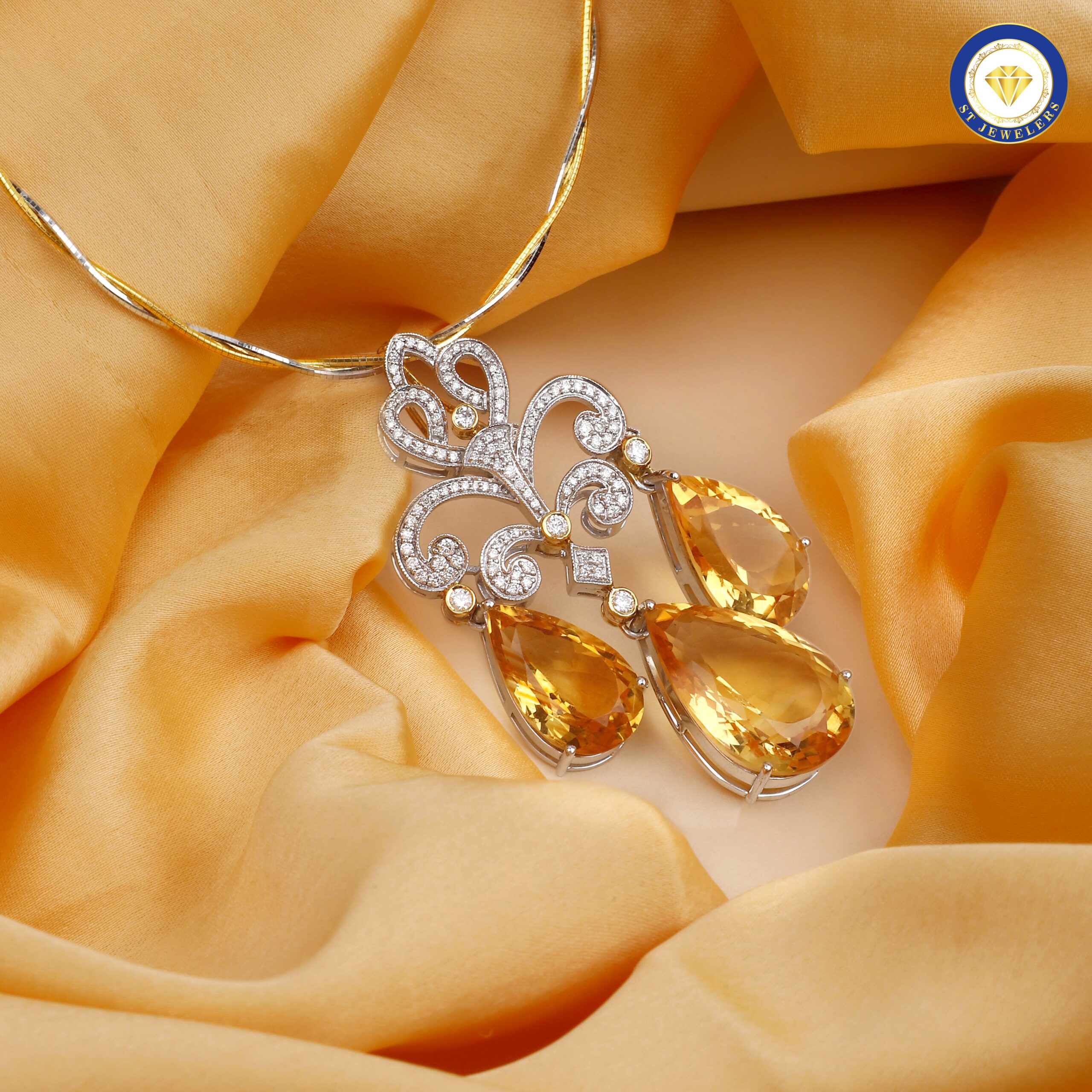 This elegant pendant showcases natural citrine stones, accented with sparkling diamonds for a radiant and luxurious design. Crafted in a harmonious blend of gold and silver, the pendant captures light beautifully while highlighting the brilliance of each gemstone. Ideal for festive occasions, formal events, or adding sophistication to any ensemble, the Drops of Trinity Pendant is a versatile accessory that exudes refined elegance. Each gemstone is meticulously set to maximize sparkle, creating a stunning display of color and light. This pendant embodies timeless craftsmanship, vibrant charm, and enduring luxury.