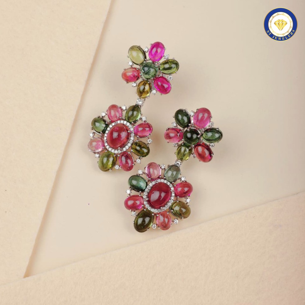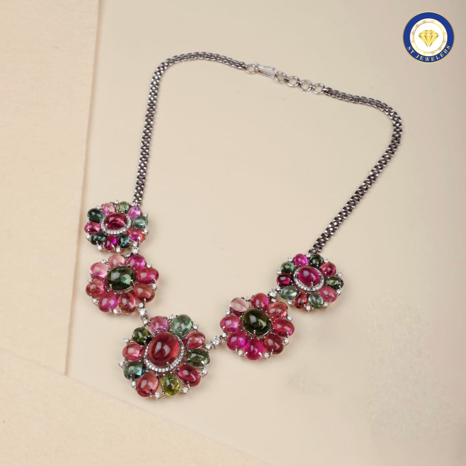 This vibrant necklace set celebrates the captivating charm of multicolour tourmalines, each stone radiating rich, lively hues that evoke the beauty of a blooming garden. Accented with sparkling natural diamonds, the design combines brilliance and color to create a luxurious, eye-catching accessory. Expertly crafted in gold, the necklace offers both elegance and durability, while the matching earrings complete a harmonious and sophisticated ensemble. Each gemstone is carefully selected and set to showcase its natural beauty, resulting in a piece that is both refined and playful. Perfect for festive occasions or special celebrations, this set exudes timeless style and radiant sophistication.