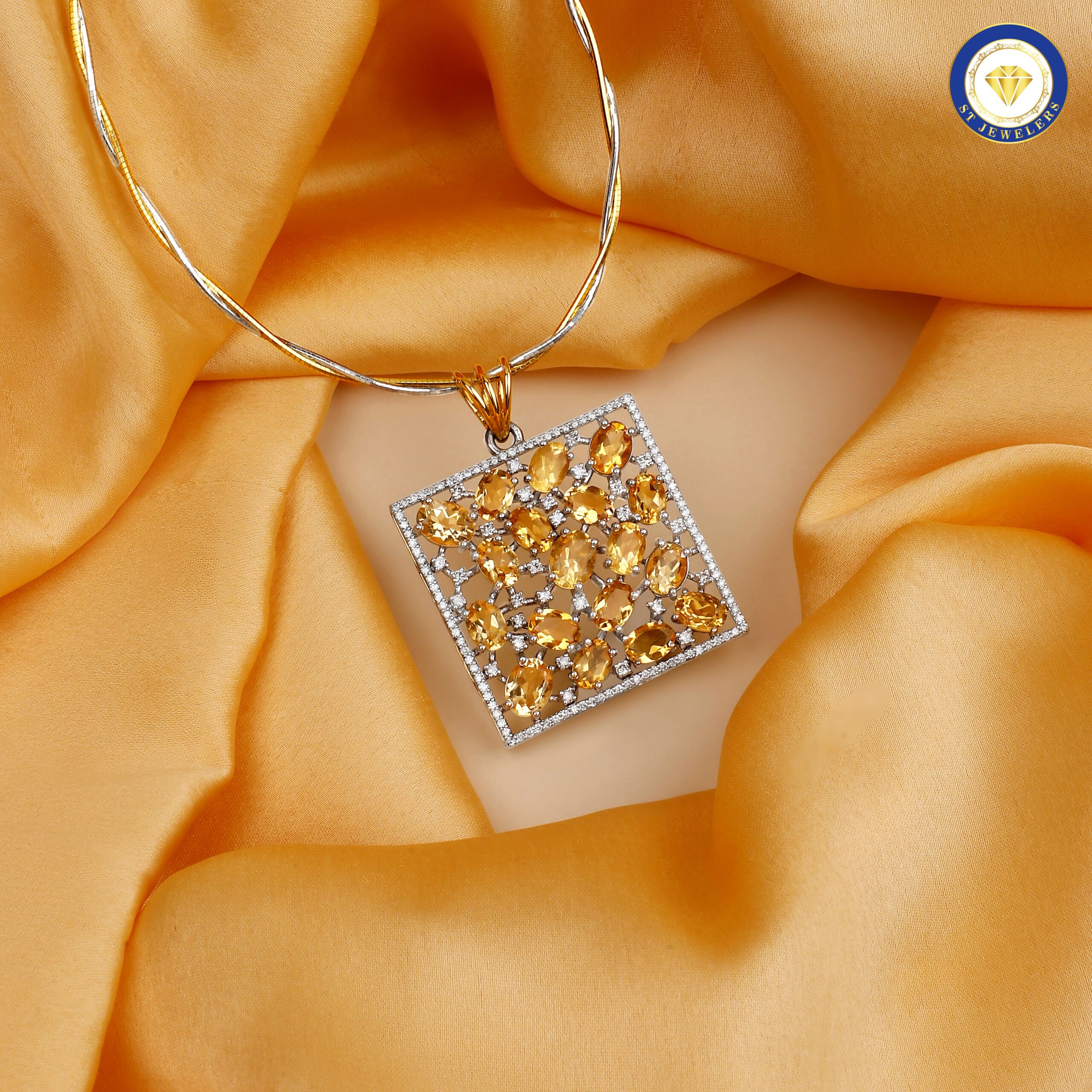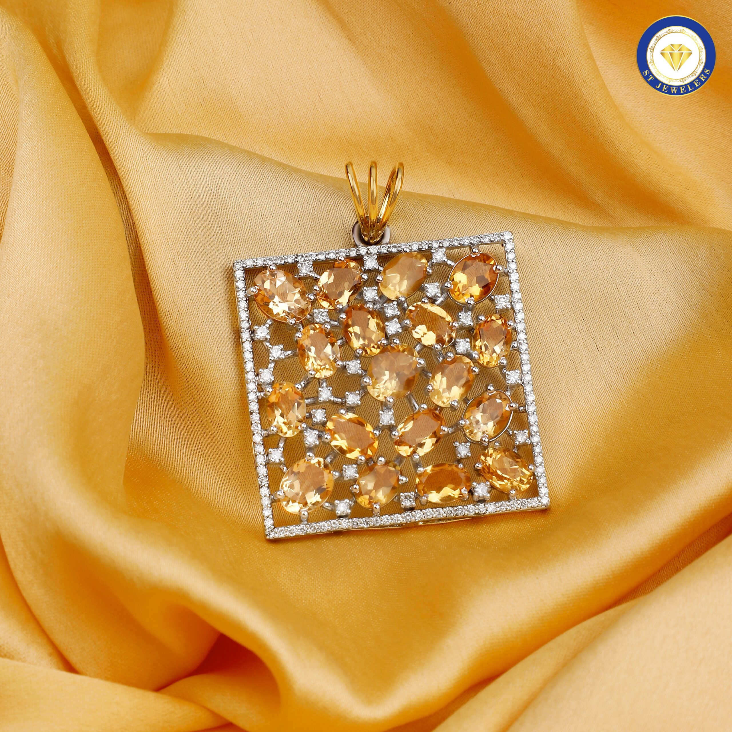 This luxurious pendant features natural citrine stones, accented with sparkling diamonds for a warm and refined design. Crafted in a blend of gold and silver, the piece radiates elegance and sophistication while capturing light beautifully. Each gemstone is carefully selected for clarity and brilliance, ensuring a vibrant and polished look. Perfect for formal events, special occasions, or adding a touch of luxury to everyday wear, the Golden Bliss Pendant is a versatile and eye-catching accessory. Its timeless design and meticulous craftsmanship make it a treasured addition to any jewelry collection.