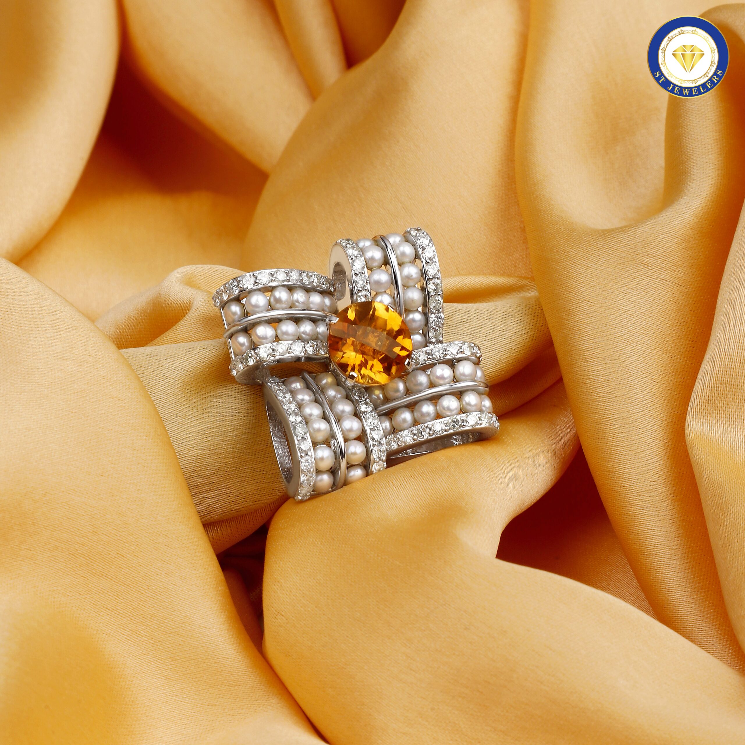 The Pearl Glamour Ring blends the soft elegance of pearls with the warm glow of natural citrine and the refined sparkle of natural diamonds. Set in gold, this design creates a harmonious balance of texture, colour, and shine. The adjustable size allows for versatile wear, ensuring comfort and ease. Ideal for those who appreciate classic beauty with a fresh twist, this ring adds sophistication to any outfit. The combination of gemstones creates a radiant, glamorous look perfect for both daily wear and celebratory moments.