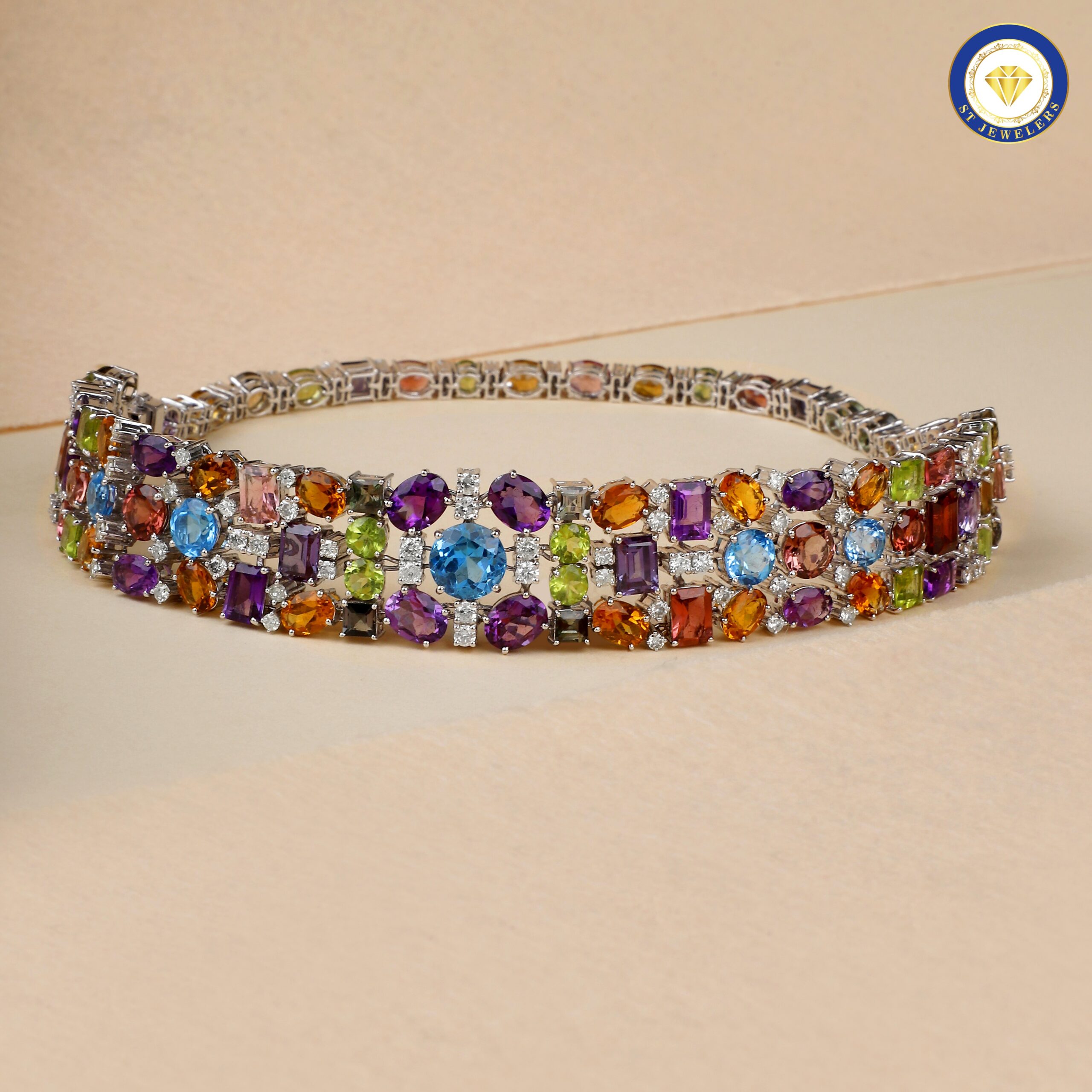 The Radiant Two in One Bracelet is an innovative masterpiece, crafted with natural amethyst, blue topaz, citrine, peridot, and natural diamonds, all set in glowing gold. Designed to offer two looks in one, the bracelet can be worn as two separate bracelets or combined to form a stunning gemstone choker. This unique versatility makes it perfect for travellers, stylists, and anyone who loves multifunctional jewellery. The colourful gemstones add brightness and joy, while the exceptional craftsmanship ensures durability and luxury. It?s a standout piece that easily elevates any ensemble with creativity and charm.
