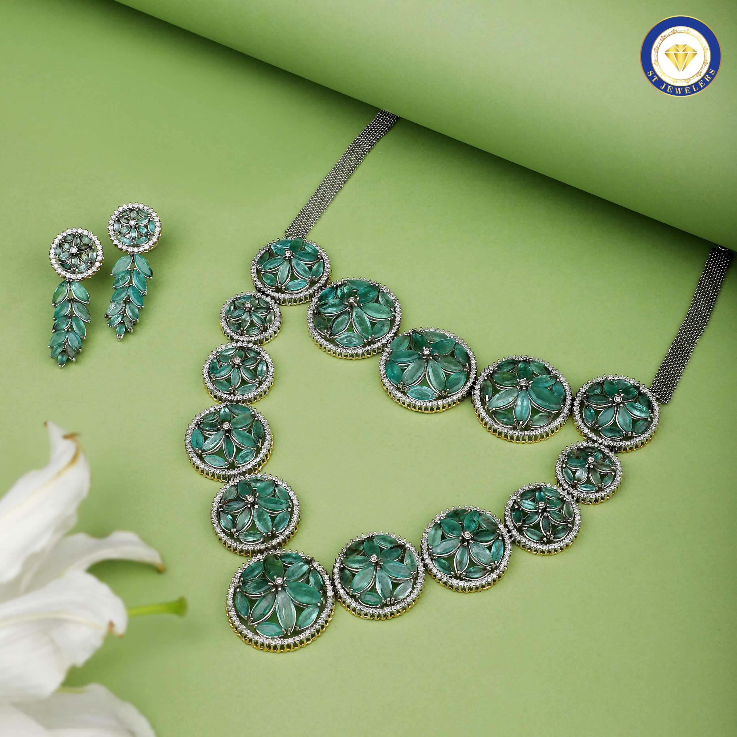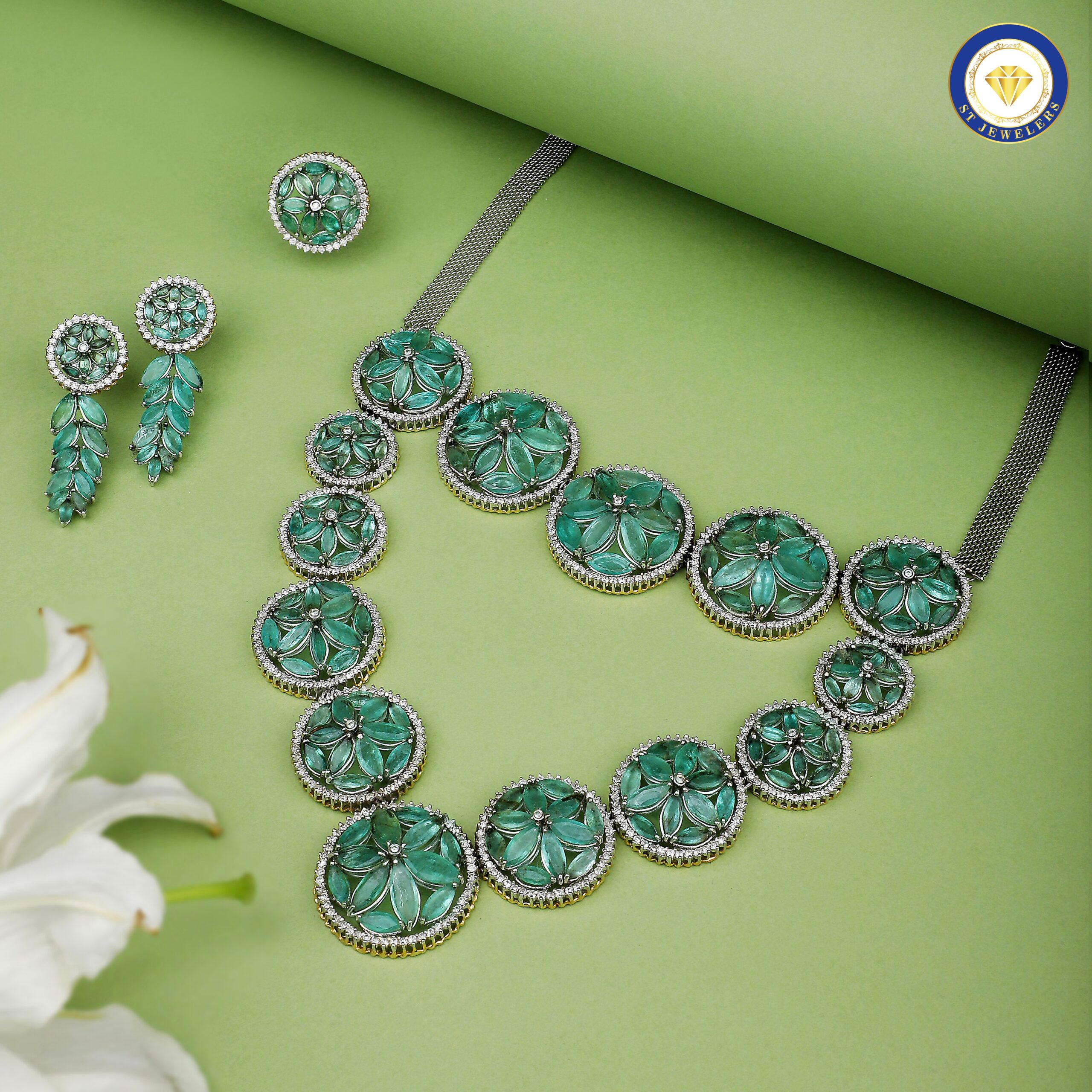 This luxurious jewelry set celebrates the timeless beauty of natural emeralds, each stone carefully selected for its rich green hue and brilliance. Accented with sparkling diamonds, the design combines elegance and radiance to create a truly sophisticated statement. Expertly crafted in a harmonious blend of gold and silver, the set includes a matching necklace, earrings, and ring, offering a coordinated ensemble that exudes refined style. Every gemstone is meticulously set to maximize its natural allure, while the craftsmanship ensures durability and comfort. Perfect for special occasions or elegant gatherings, this set embodies luxury, timeless elegance, and vibrant sophistication.