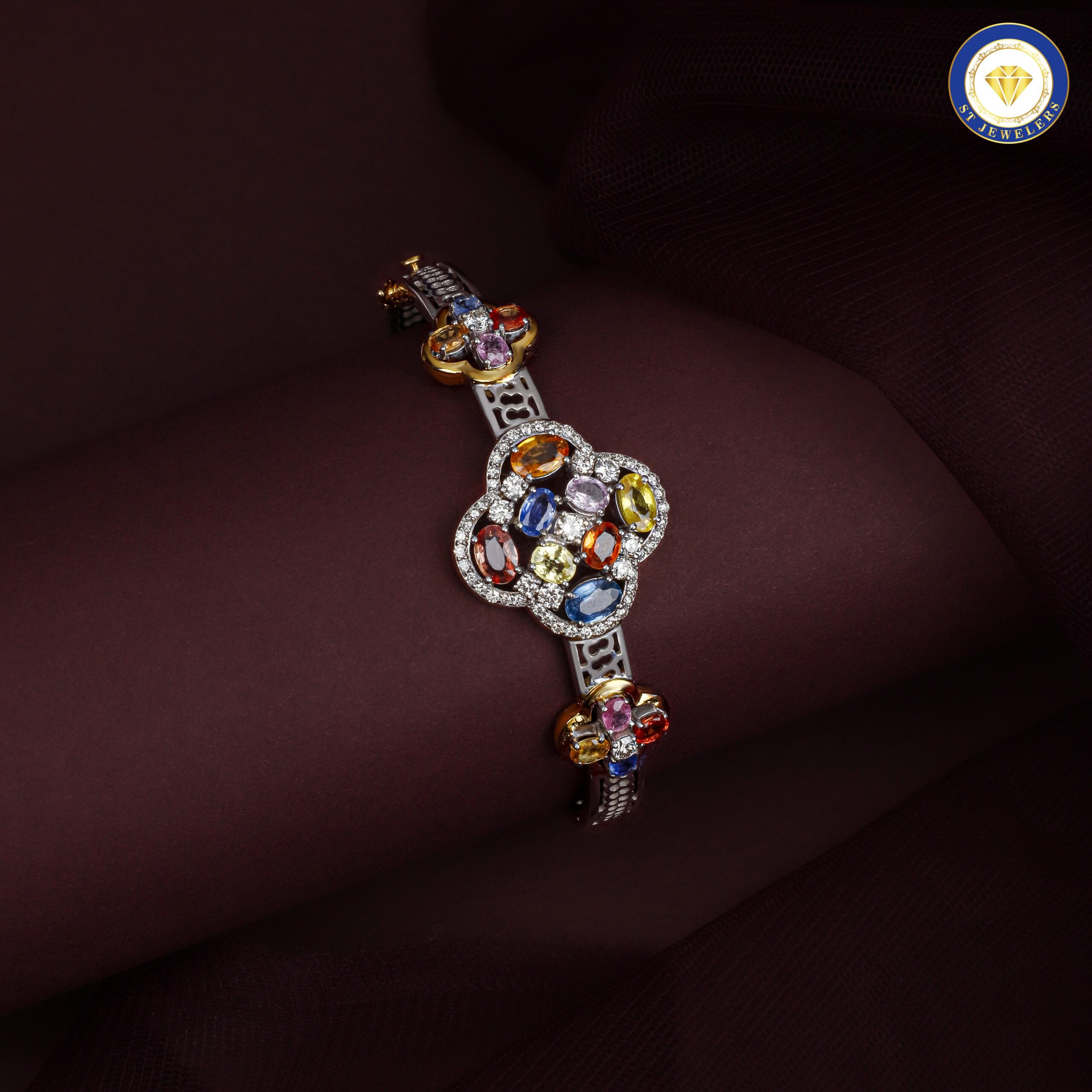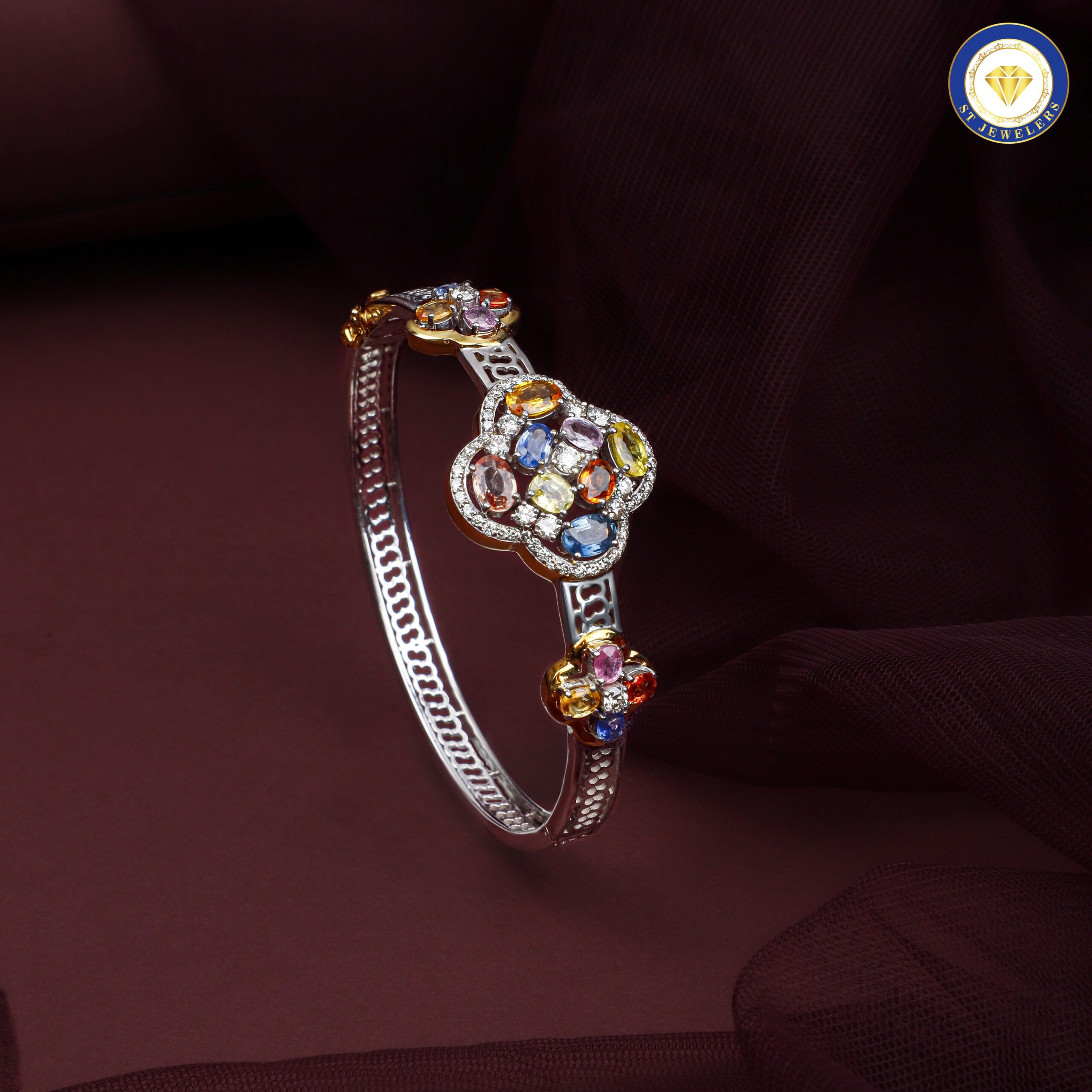 The Multicolour Clover Bracelet is a stunning expression of colour, featuring natural multisapphires and natural diamonds arranged in a playful yet elegant clover-inspired design. Set in a blend of gold and silver, this oval openable bracelet (size 2.4) adds charm and sophistication to your jewellery collection. The vibrant hues of the sapphires create an uplifting, joyful feel, while the diamonds add refined sparkle. Whether worn with traditional attire or modern fashion, this bracelet becomes a vibrant signature piece that brings life and luxury to any outfit.